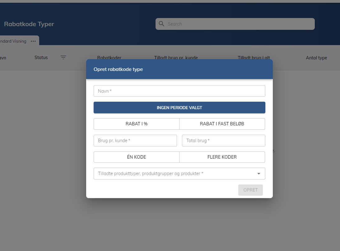 For at kunne gør brug af rabatkoder, skal man først oprette en rabatkode-type. En rabatkode vil aldrig kunne give en negativ kurv-total, og vil derfor ikke kunne bruges til at give penge tilbage til kunden