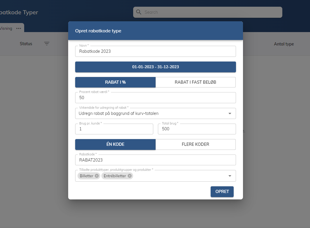 Udfra de valgte værdier i eksempel, vil rabatkoden virke på følgende måde: Der vil blive oprettet én rabatkode med koden "RABAT2023", som vil give 50% rabat på kurv-totalen, og kan kun bruges én gang pr. kunde og 500 gange i alt. Rabatkoden kan kun bruges på billetter og entrébilletter.