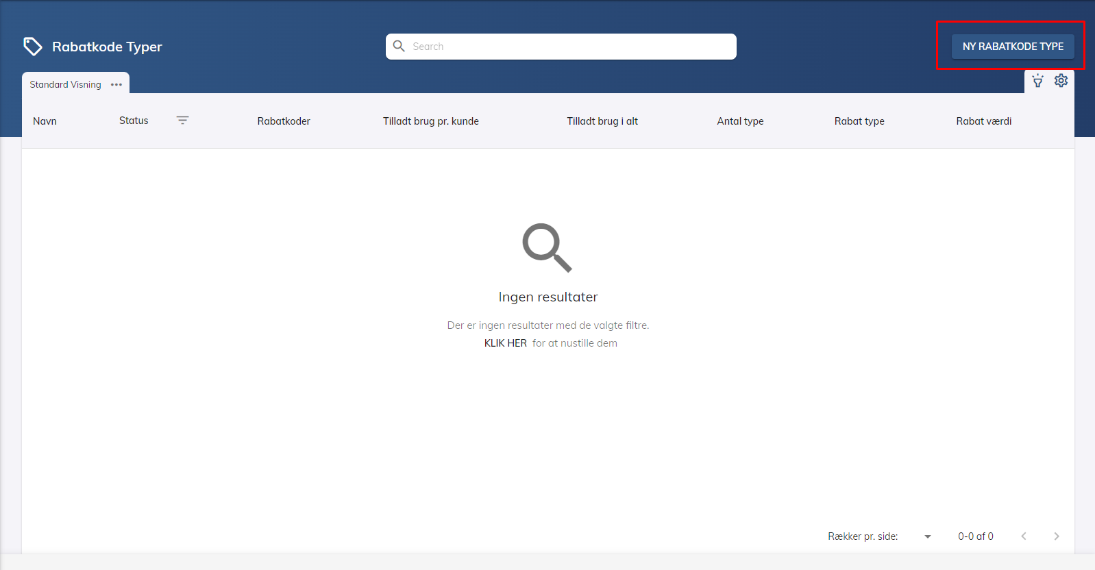 - Klik på knappen Ny rabatkode type i øverste højre hjørne.