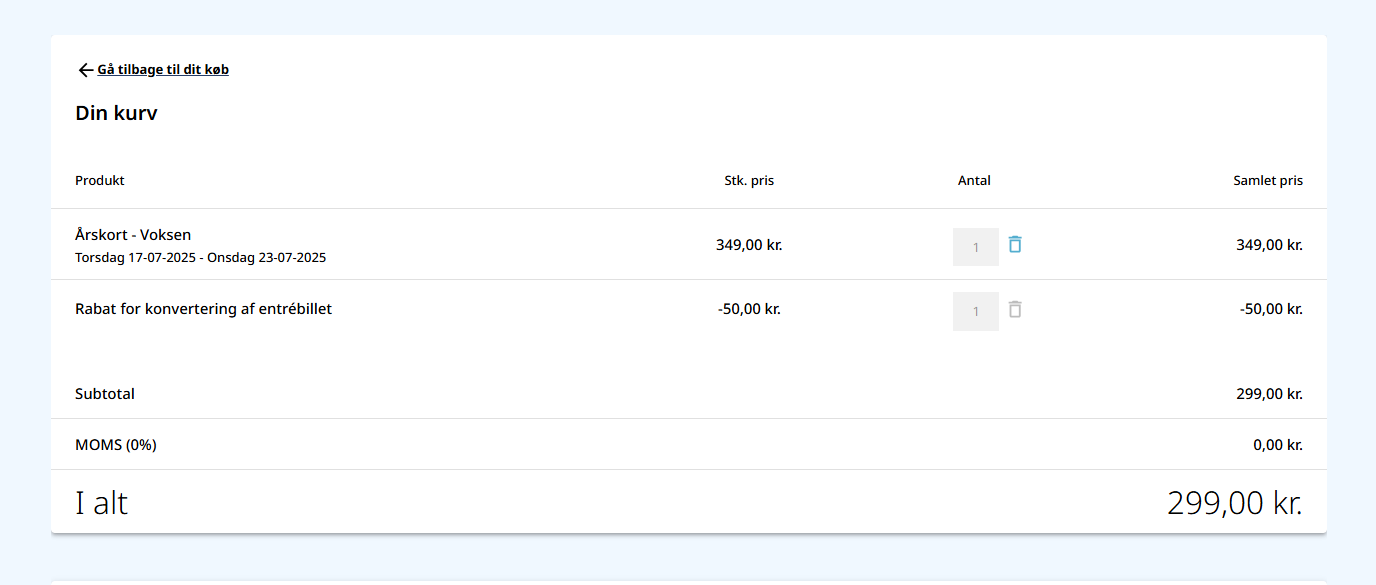 - Kunden gennemfører købet som normalt, hvor rabatten fra billetten trækkes fra den samlede pris