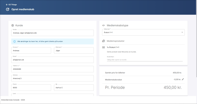 - Vælg hvilken kunde medlemskortet skal oprettes til Her kan du vælge at oprette medlemskortet til samme kunde som du opretter medlemskabet til.