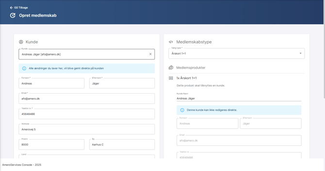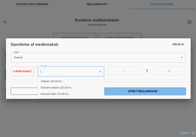 - Vælg hvilken kunde du gerne vil oprette medlemskabet til. Du har også mulighed for at oprette en ny kunde, ved blot at indtaste for- og efternavn på den nye kunde og klikke på "Opret ..."